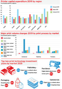Richard Gray, Operations Director at Printfuture, stated that for the first time they asked specifically about the broader socio-economic pressures and there were two clear patterns reported across the globe. He continued, “For the developed regions the focus was concern about the risk of, or reality of, economic recession in the country or region, followed by concern about global trade wars and the impact of global warming/environmental pressures. For the developing regions, it was corruption and political instability creating economic recession that dominated. Clearly, we must now add the impact of the coronavirus, a concern for all which, however, is not yet represented by the report.”