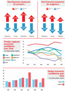 Globally 17 percent more printers described their company’s economic condition as ‘good’ compared with those who reported it as ‘poor’. For suppliers the net positive balance was even stronger at +32 percent. However, there is a clear trend with confidence peaking in 2017 after the long slow recovery following the 2007-08 recession and a more cautious approach developing since. As always, conditions vary between markets and regions.