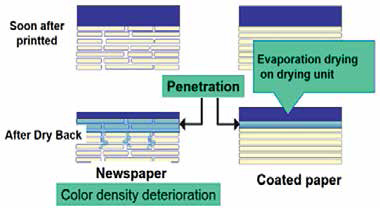 Now look at the figure with caption ‘Penetration of ink’, the penetration of ink occurs soon after printing and this penetration involves degradation of optical density because pigment also penetrates inside the paper. Then after dry, less pigment remains on the surface. However, heat set ink on coated paper dries immediately after passing through heater, so ink penetration is very less.