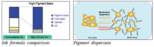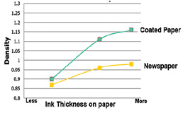 As shown in the figure captioned ‘Ink thickness & density relation’, due to dry down in newsprint, it is difficult to get very high density even with high ink thickness. Therefore if high density is required with conventional ink very high ink thickness is required, which means high ink consumption.