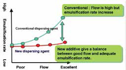 As shown in the figure with caption ‘Ink formula comparison’, high density inks contain high pigment and less filler. However, high pigmentation leads to high viscosity and short flow in ink which results in poor ink transfer on various news printing machines. High pigment loading also leads to re-agglomeration of pigment in ink which results in poor grinding, loss of strength and density and poor flow as illustratively shown in the figure captioned ‘Pigment dispersion’. To tackle these challenges, SAKATA INX uses a specially designed dispersion additive and resin system which gives good and stable dispersion in ink. Also, this new generation additives help maintain good emulsification and flow during printing as shown in the figure captioned ‘Emulsification and flow during printing’.